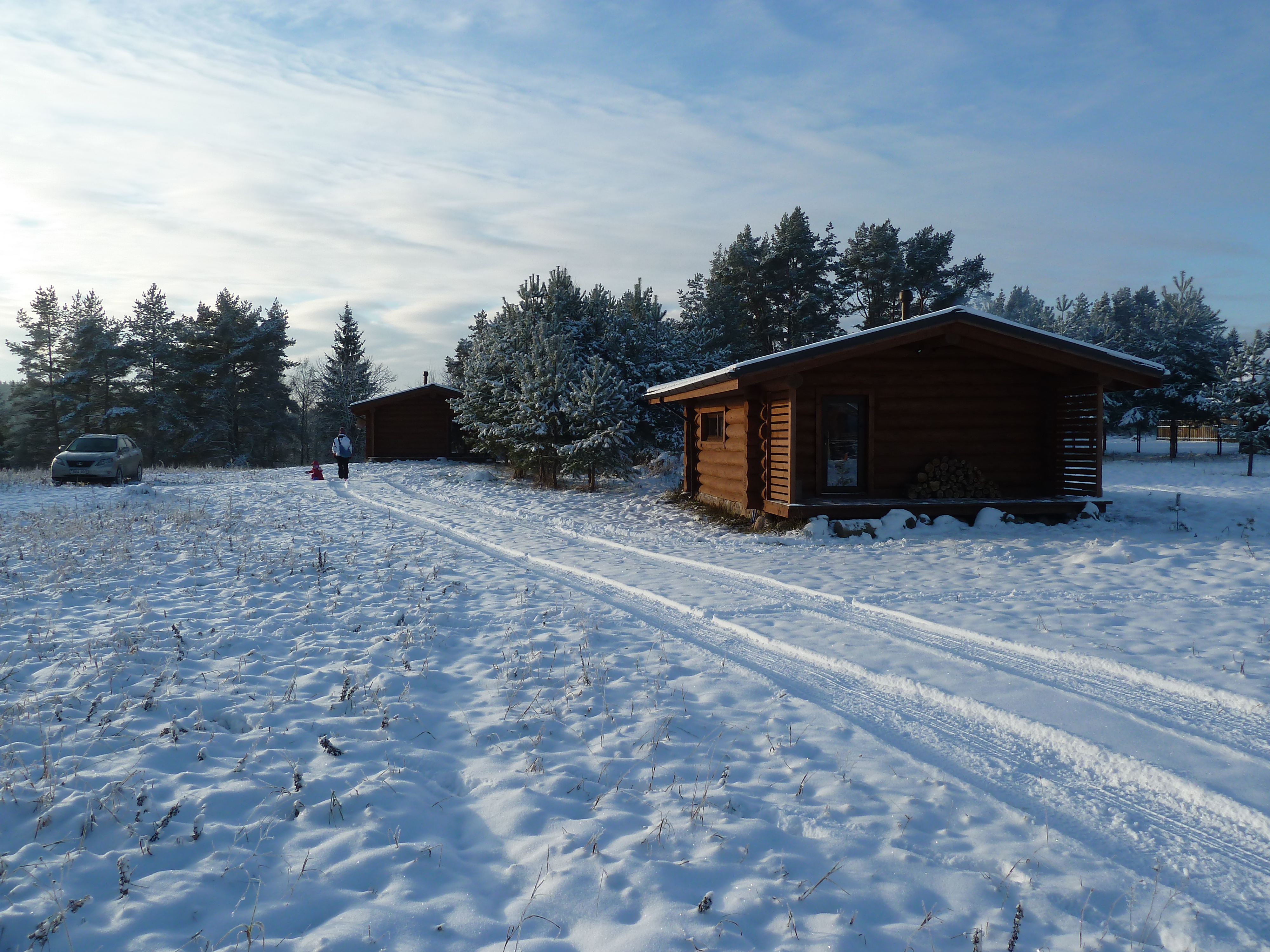 Для комфортного круглогодичного размещения компании до 5 человек предлагается два небольших деревянных одноэтажных гостевых домика общей площадью по 25 метров квадратных каждый, в одном из которых расположены жилая зона, состоящая из двух двуспальных диванов и оборудованная зона кухни, разделённые барной стойкой.